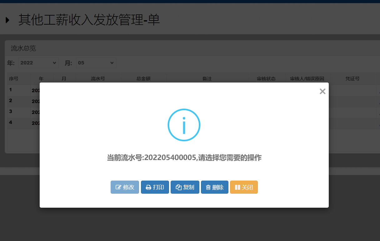进入“其他工薪收入发放管理-单”下可以查看目前已保存/提交的申报流水信息,审核状态有“已保存”、“已提交”、“已审核”、“已退回”几个状态,对于已审核的有相关审核与凭证号信息。更多操作可以实现对,当前状态下的申报流水单的提交、复制、删除、打印等功能。如下图: