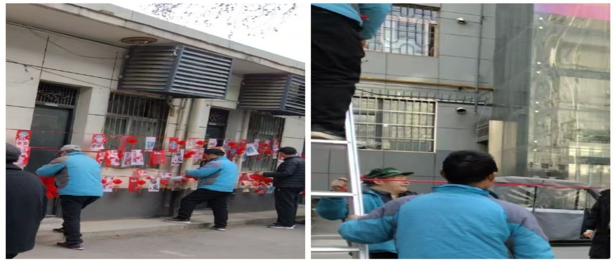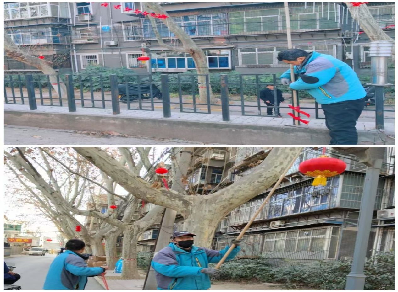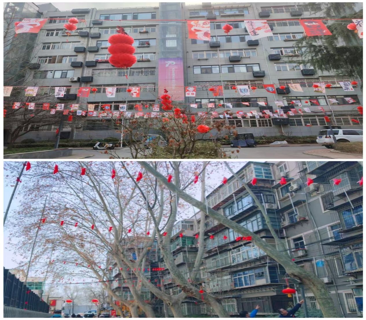 本次装点以安全美观、节能温馨、文化赋能为原则,重点打造区出入口、主干道等核心区域。工作人员分工协作、细致施工,从提交装点方案--物品采买组装零件现场布置,每一名员工不畏辛苦,欢欢喜喜的进行春节装点。在十号楼前装点彩旗与彩灯、红灯笼与马年主题装饰,每个灯杆上挂上大红灯笼家属区东门悬挂风车、流星雨彩灯等,整体氛围庄重热烈、雅致温馨。夜幕降临,灯火交映,园区处处流光溢彩,年味十足。
