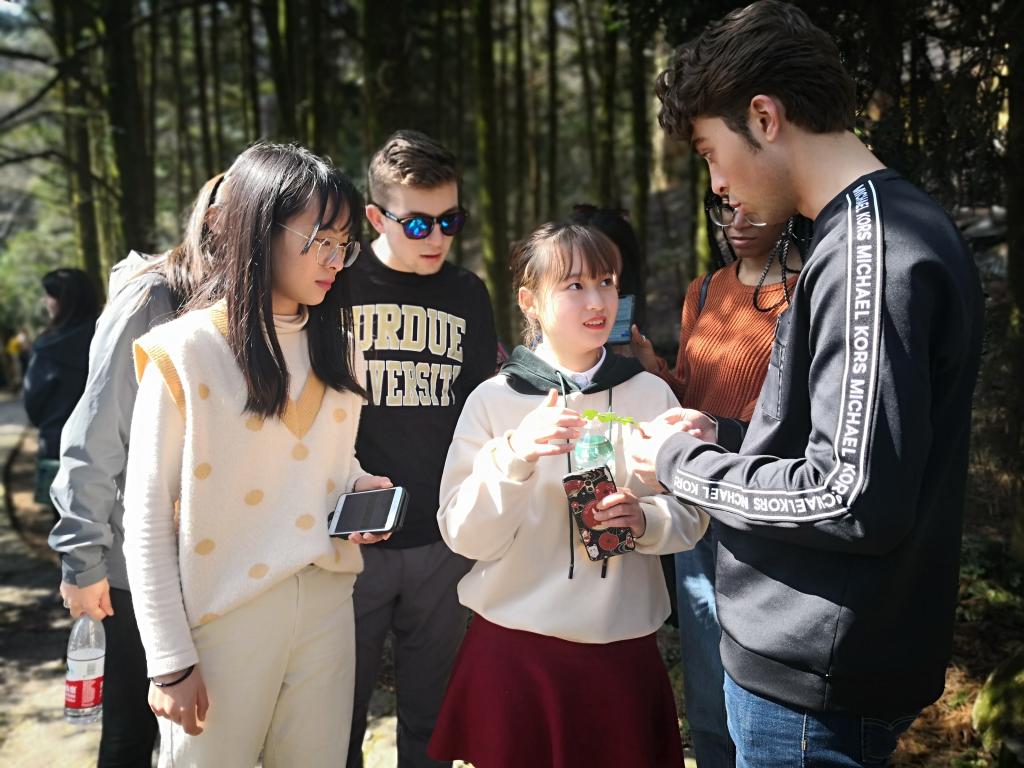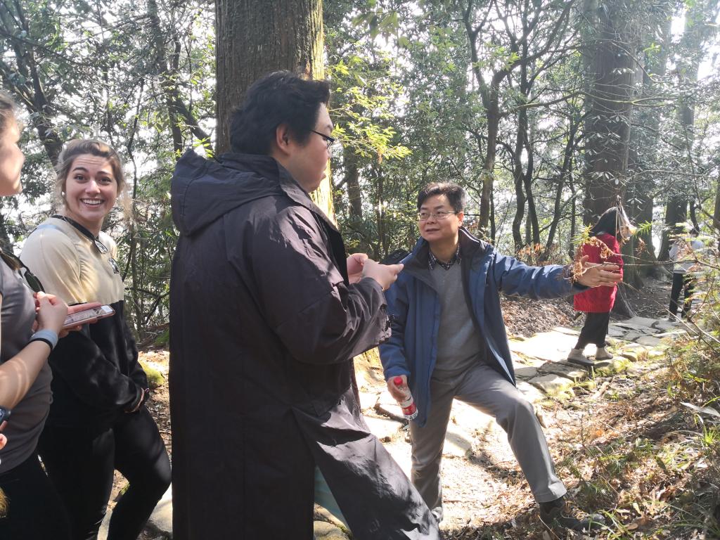 在杭州临安市天目山景区,中美师生无不感叹大自然的魅力,大家听着导游的介绍,对这里更显向往。我院同学们向普渡大学师生介绍植物的中文名字以及中文发音,友谊更近一步。在山间路上,石森林老师为中美学生们介绍药用植物,讲解相应的中药功效。在天目山顶,林敏同学为美国学生展示太极拳,并进行简单教学,以太极魅力展现中国文化之精深。紧接着,美国学生分成四组,每组由我院两位同学带领,识认天目山的植物。我院同学们将植物的英文名、中文名、拉丁名以及中药功效细细道来。由于文字含义等因素,美国同学对中药功效具体意义有所不解,但我院同学们用英文,结合通俗有趣的叙述,使大家在欢声笑语中熟悉了各类中草药。天目山路途崎岖,中美学生互相搀扶帮助,是友谊的再一次升华。