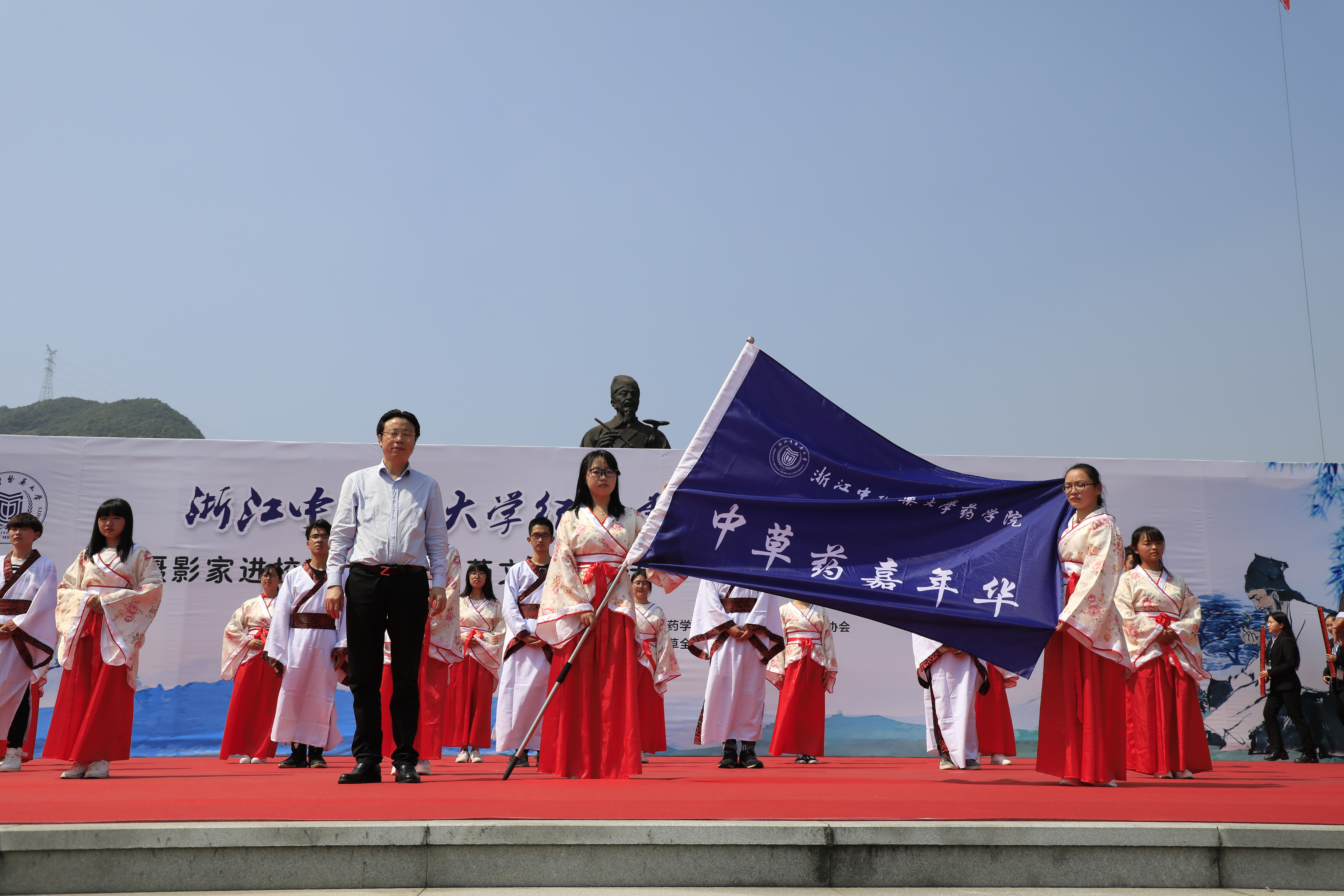 启动仪式上,18名身着汉服的药学生在浙江省首届高校优秀教师、药学院中药资源所副所长(主持工作)张水利教授的带领下,进行了庄严的药学生宣誓仪式。随后,张光霁副校长为药学院中草药嘉年华团队授旗,而由79名同学共同完成的纪念李时珍五百周年快闪仪式也在时珍广场火热上演,校园旗舰站两大会场的活动也随之正式展开。