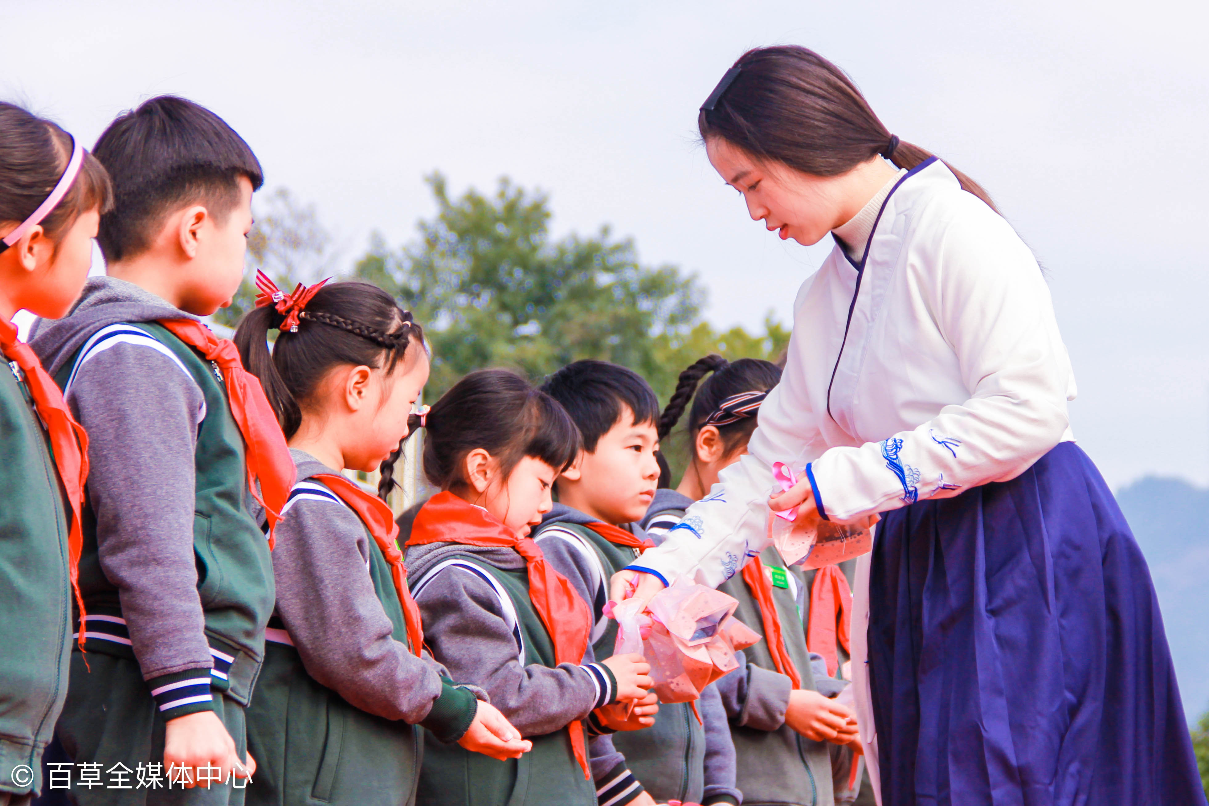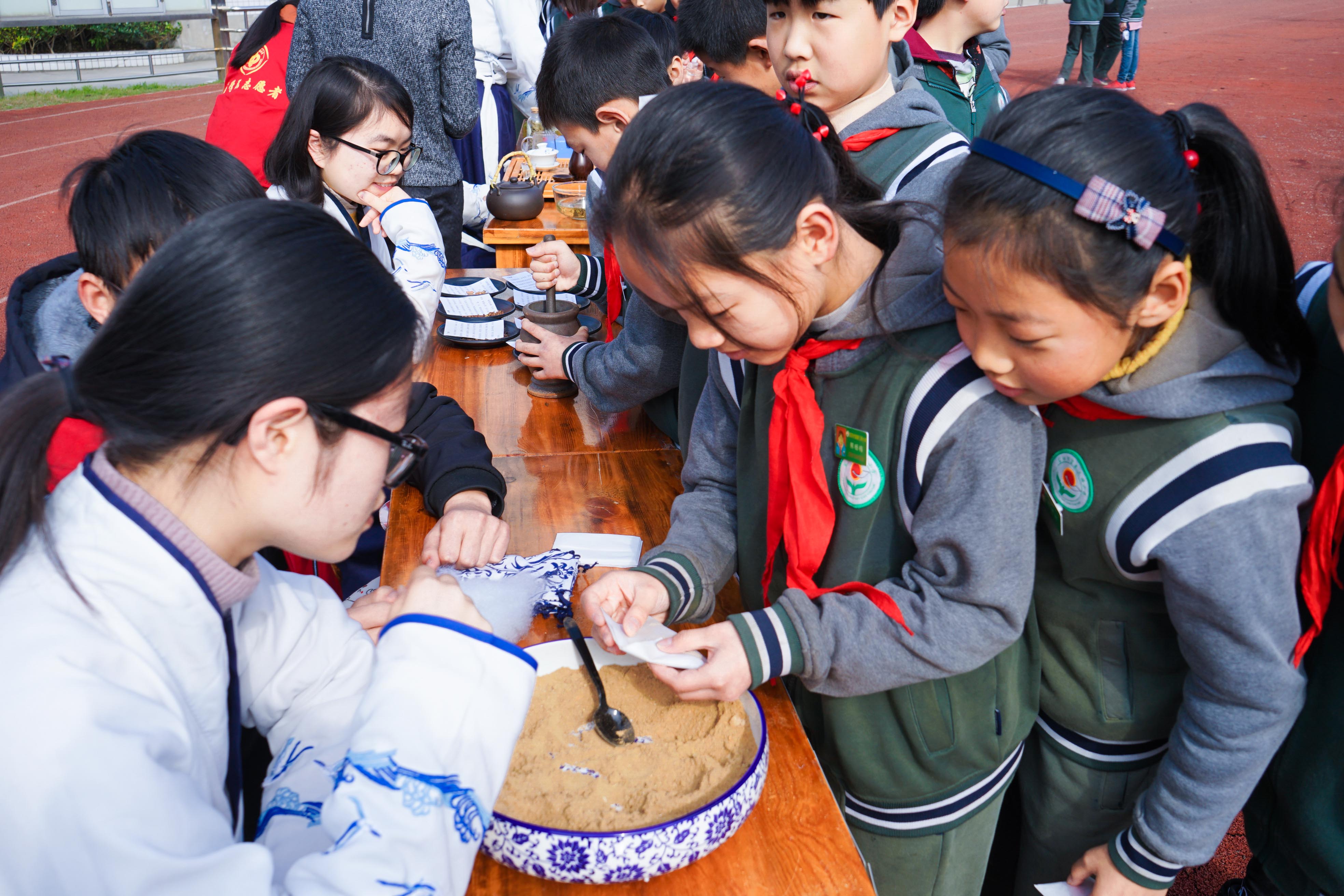 三桥小学陈校长首先发表了讲话,她鼓励学生们努力学习,提高自己,热爱母校,奉献社会。药学院党总支副书记滕贺圆老师引导同学们热爱传统文化,不断传承中医药的优秀文化。学工办主任曹俊以及团委朱海蔚老师也参加了此次典礼。随后,我校六位大学生代表向三桥小学的学生代表们分发象征着希望与传承的种子,不仅仅希望在新的一个学期同学们能够更进一步,同时更加希望中医药事业能够薪火相传,经久不息。最后我院本草社的同学们为三桥小学的同学们带来了中草药嘉年华活动。志愿者们为小朋友们准备了许多有趣的游戏,中药扎染、锦囊妙“系”、茶道表演、望闻问药,丰富多彩的活动受到了小学生们的热烈欢迎和积极响应,同时也让小同学们切身的体会到了中医药的无穷魅力。