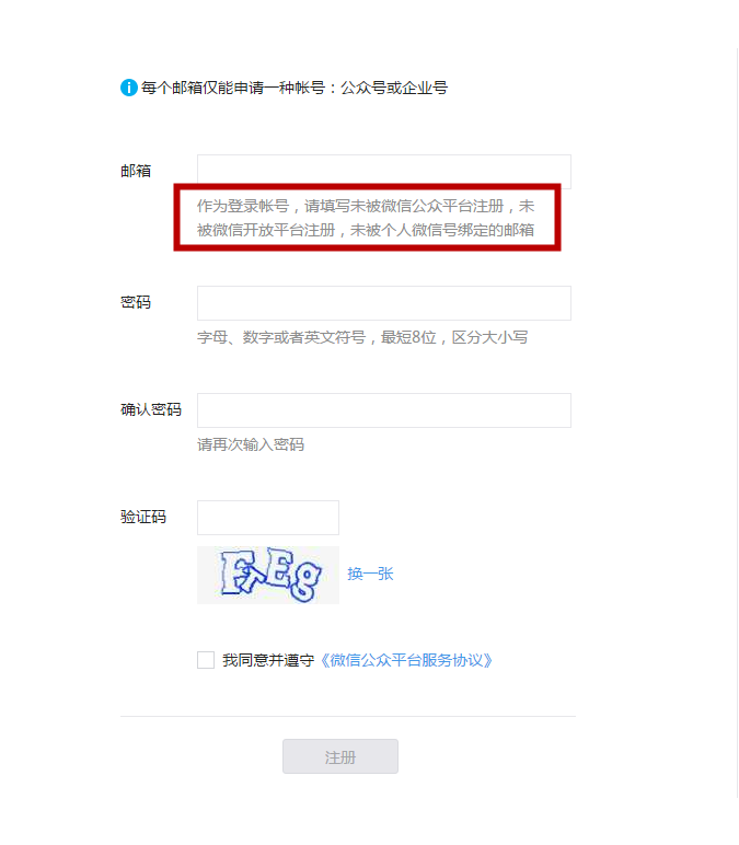 2.用邮箱注册(该邮箱需未被微信开放平台注册,未被个人微信号绑定的邮箱)