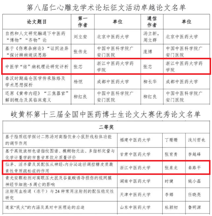 近日,第八届仁心雕龙学术论坛征文活动和岐黄杯第十三届全国中医药博士生论文大赛结果陆续公布。药学院张芯老师撰写的《中医学“结”病机理论研究评析》获评第八届仁心雕龙学术论坛征文活动卓越论文,张泉龙老师撰写的《仙茅、淫羊藿及其配伍从神经-内分泌途径调控糖皮质激素性骨质疏松症的作用》荣获岐黄杯第十三届全国中医药博士生论文大赛二等奖。