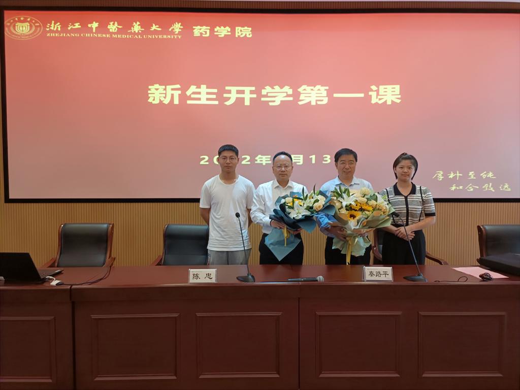 开课前新生代表向陈校长、秦院长祝以节日问候并献花。陈校长首先对全体药学新生加入药学院表示欢迎。他简要介绍了学校的发展历程和变迁之路,讲述了学校的悠久历史与光荣传统,回顾了中医药为国家发展世界进步作出的突出作用和重大贡献,阐述了学校创建一流中医药大学的时代背景和重大机遇。“药学是应用基础学科,药学的人才培养必须紧扣医药产业发展的需求。”陈校长从“医药行业现状”“中国制药企业的市场地位”“我们能在产业链中做什么?”等不同角度不同层面,引出了药学行业面对的机遇和挑战,阐述了药学人需要的责任和担当。