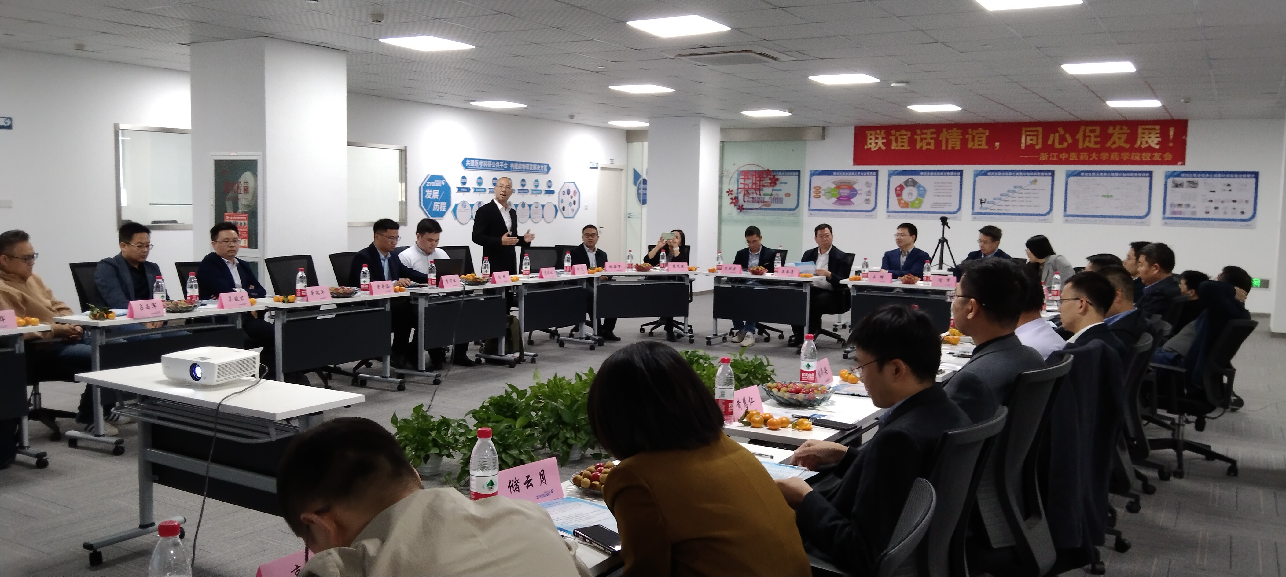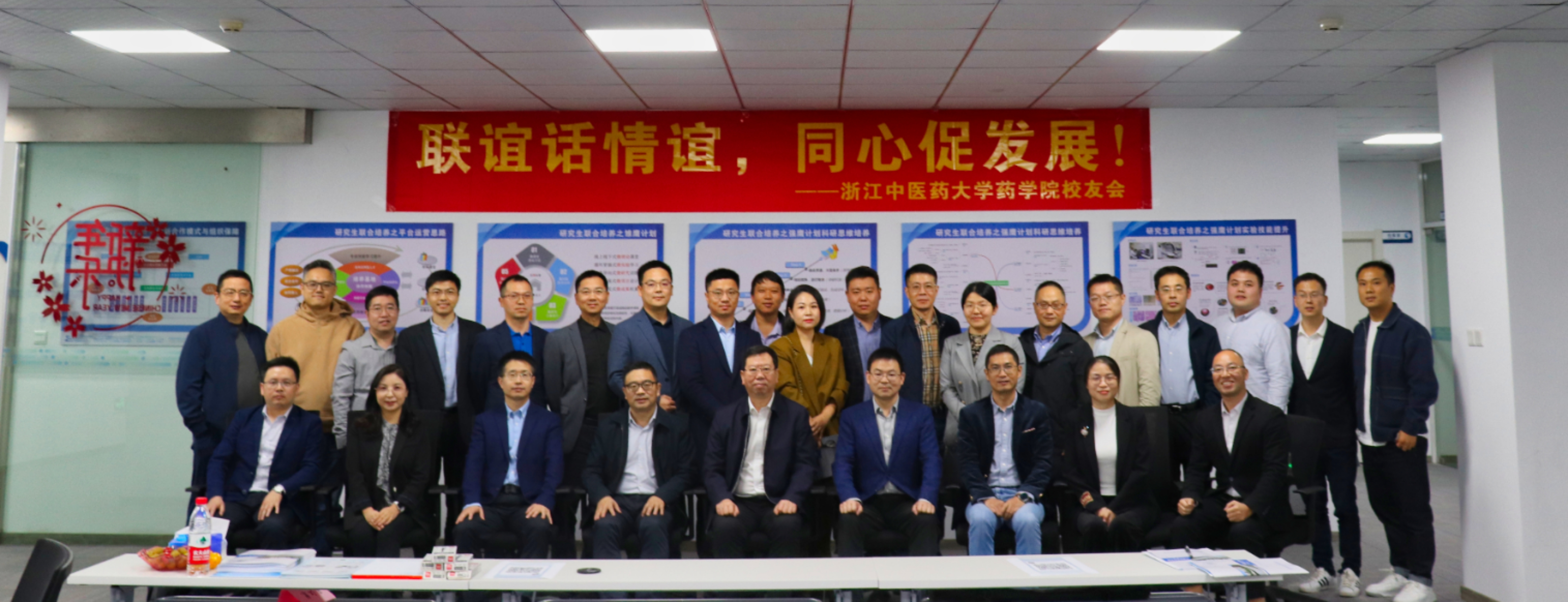 联谊会汇聚了来自浙江省药监局药品流通监管处、杭州市食品药品检验研究院、余杭区第一人民医院、浙江鹰旸医药研发有限公司、杭州暖心科技有限公司、国科大杭高院创新创业与产业孵化中心等30多位校友、校友企业代表。