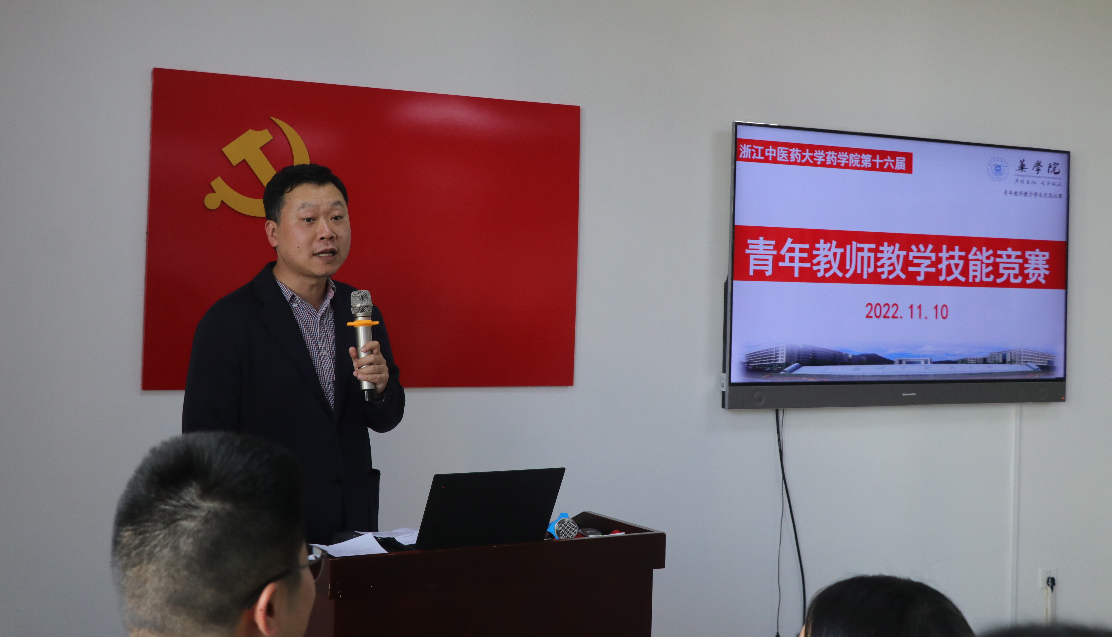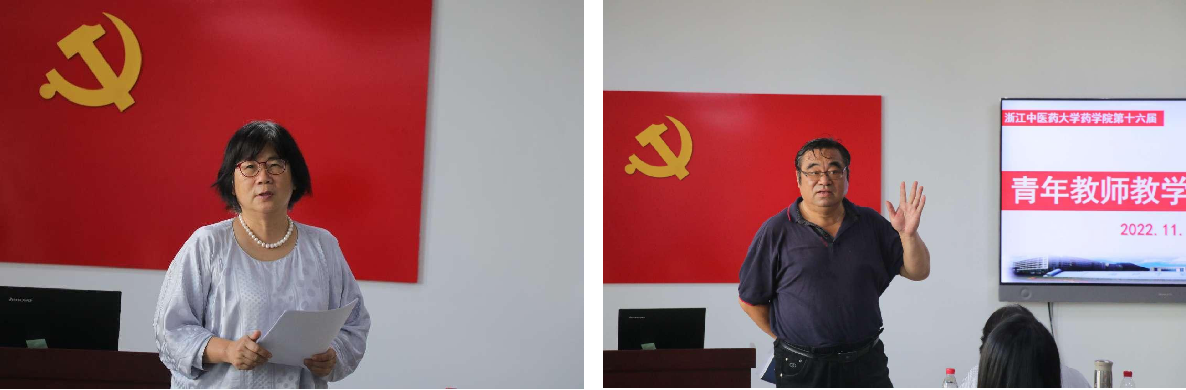 说课结束,邵加教授和严云良教授分别做精彩点评。邵加教授结合参赛教师的表现,指出选手在说课过程中的一些共性问题,并就每位选手的具体情况逐一进行点评。严云良教授分享了青年教师参加省级教学技能比赛的实际案例和宝贵的经验。此外,谷院长还邀请了药物分析教研室主任寿旦教授分享对本次比赛的感受,寿教授用“学习”、“欣喜”、“专业”三个词做了高度概括。