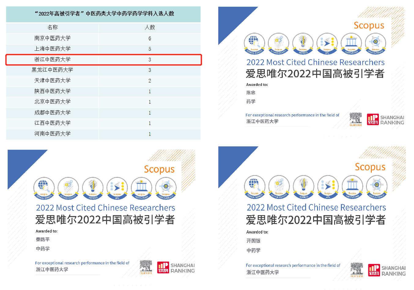 本次入选“中国高被引学者”榜单的中国学者共计5216名。其中中医药类大学共计11所45名学者入选,我院入选的3位学者分布在中药学药学学科,入选人数位列全国同类院校第三名。