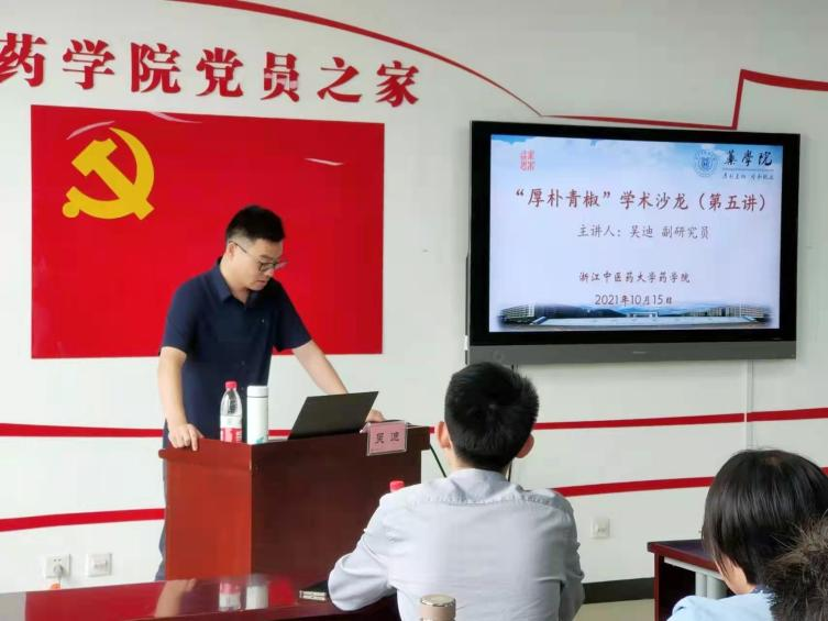 为了更好地营造浓厚的学术氛围,进一步促进青年教师之间的学术交流,2021年10月15日下午,“厚朴青椒”学术沙龙邀请中医药科学院吴迪副研究员为药学院青年教师作题为“聚多巴胺纳米递药系统”学术讲座,此次学术活动由学院副院长曹岗研究员主持,全院40余名师生参与。