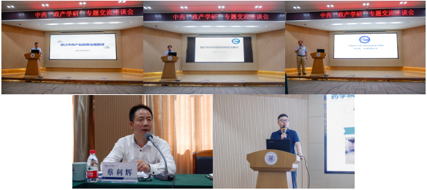座谈会上,陈月华处长、金樟照调研员、姜舜尧副局长分别就“浙江中药产业政策法规”、“医疗机构中药制剂研发注意点”及“中药饮片不符合药品标准尚不影响安全性、有效性的认定”进行了讲解和阐述;蔡利辉副处长就我省中药产业发展现状、当前面临的机遇、难点问题及相关政策进行了解读和说明;药学院曹岗副院长向与会代表介绍了学院发展历程及主要的研究团队、研究领域、社会服务开展情况及取得的成果,并表达了希望和企业一道产学研合作共同推进我省中药产业发展的意愿。