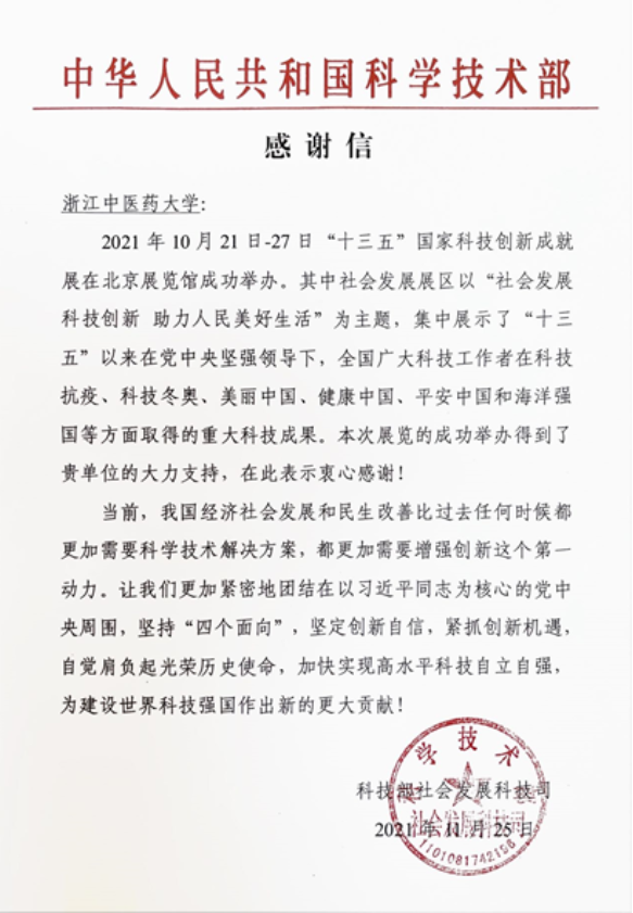 近日,科技部社会发展科技司致我校感谢信,就我校对“十三五”国家科技创新成就展的支持表示衷心感谢!同时勉励我校应坚定创新自信,紧抓创新机遇,为建设世界科技强国作出新的更大贡献!