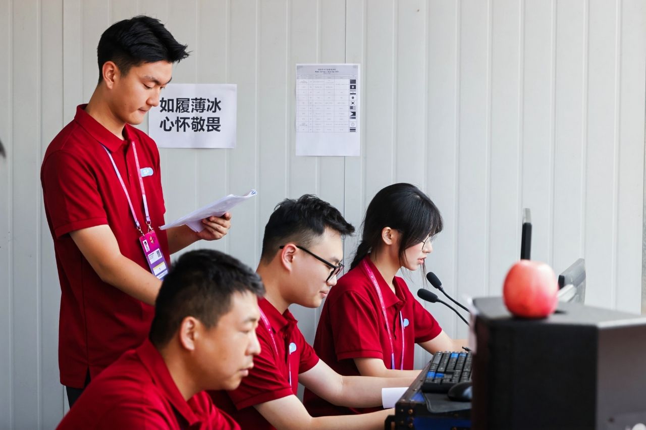 尽管工作内容与其本专业不尽相同,但曹舜禹深知时效要求之严苛。“比赛日午后气温逼近40℃,冰块易融化,我们必须精准把握运动员比赛间隙的短暂时间完成运送。”他每天运送冰块次数超过50次,工作时长逾12小时。记者见到他时,长时间户外工作使他肤色黝黑发亮。“‘零疏漏、零差错、零遗憾’不仅是纸面标准,更是我们立下的‘军令状’。”曹舜禹坚定地说。