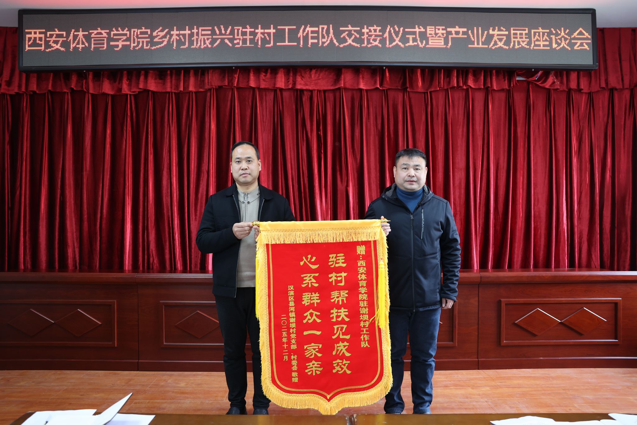交接仪式上,县河镇为西安体育学院和谢坝村驻村工作队员颁发了锦旗和特殊贡献奖证书,谢坝村也为驻村工作队员赠送了锦旗,以表达对他们辛勤付出的感激之情。随后,谢坝村新老驻村工作队进行了队旗交接,标志着新一轮驻村工作正式拉开序幕。