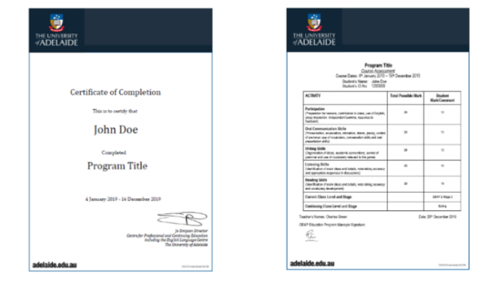 下图:阿德莱德大学项目证书与成绩单样图