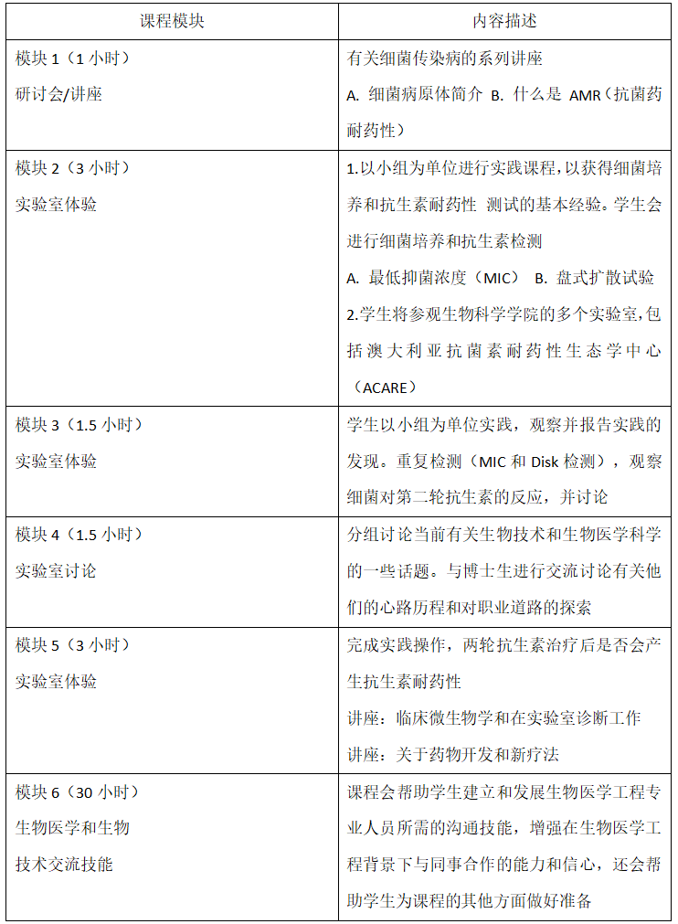 本项目由澳大利亚两所世界级院校,悉尼大学与阿德莱德大学共同参与设计实施,面向药学、医学与相关专业学生,一方面旨在提升学生在生物医学和生物技术领域的专业研究技巧,并深入了解抗生素耐药性及相关感染问题;另一方面,通过参加商务沟通与领导力密切相关的不同类型英语课程,学生的专业沟通能力、团队协作技巧、领导力、与解决问题能力均将得到全面提升,未来将能够更加自信地从事药学、医学领域的研究、团队项目等专业工作。