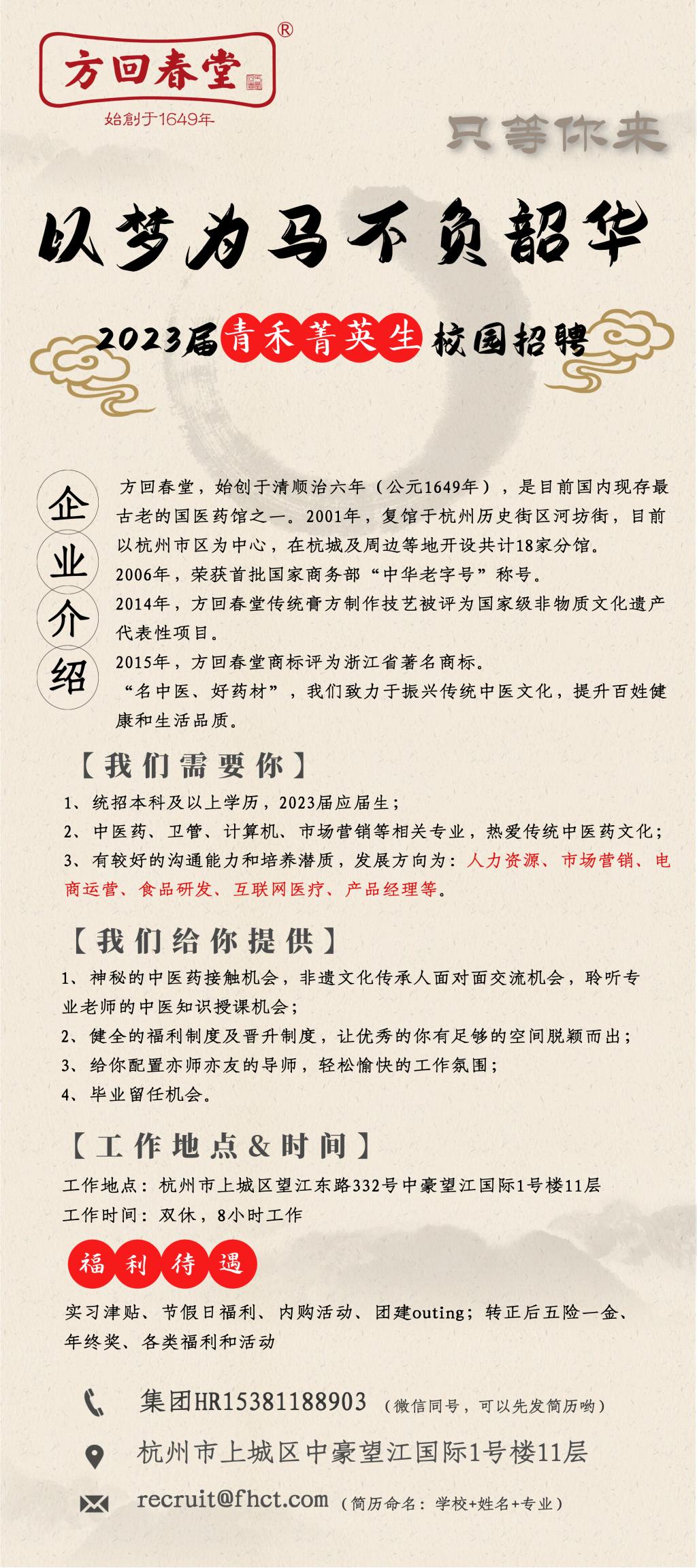 招聘详见材料,同时方回春堂集团中药分公司,在质量管理招药学、中药学的管培生,学生干部优先,也可直接 联系下图方式