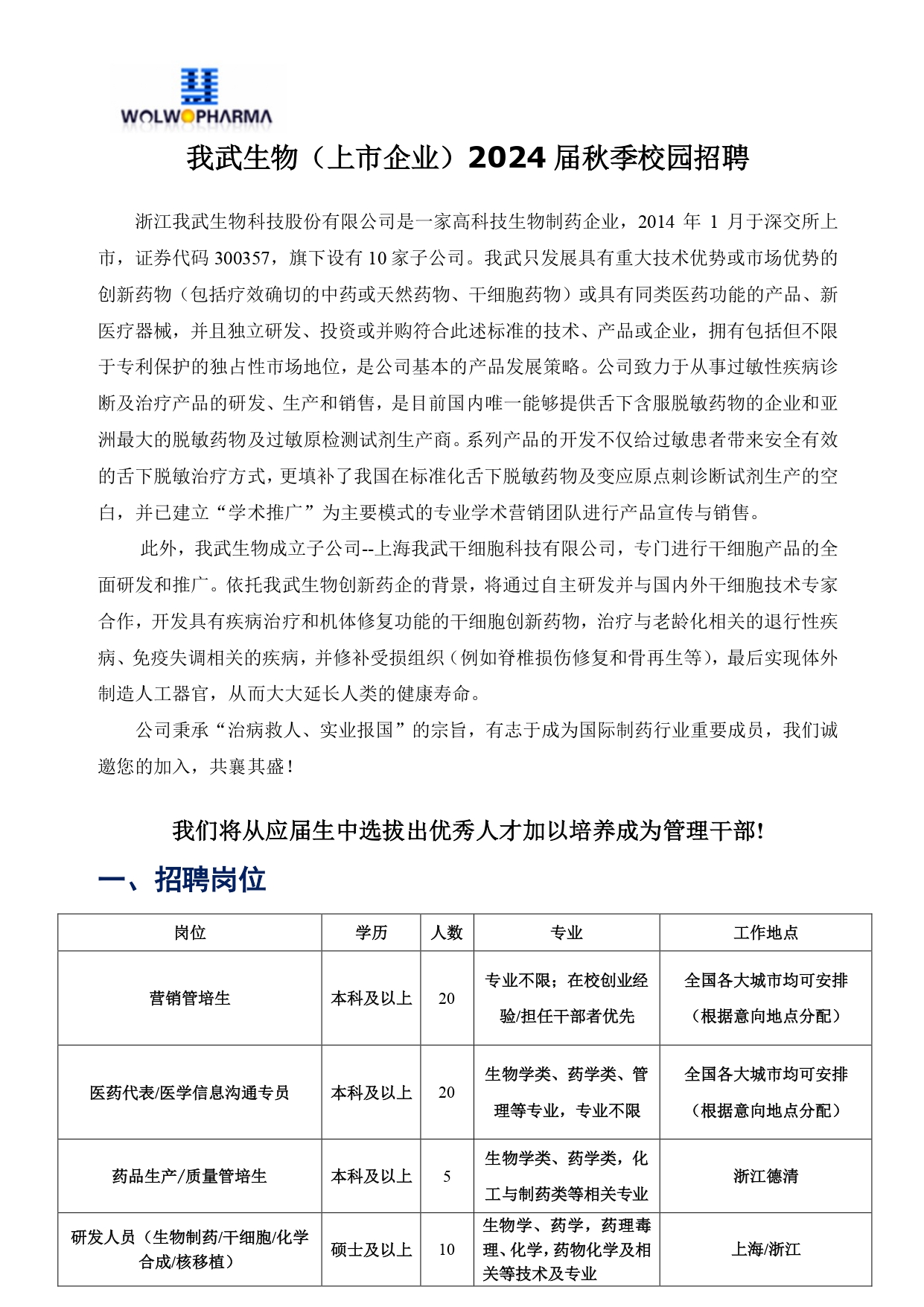 我武生物(上市企业)2024 届秋季校园招聘