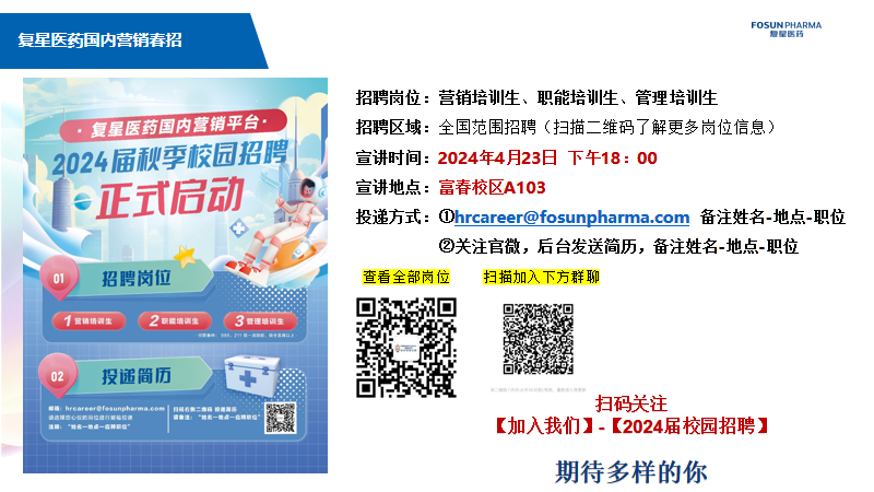 更多信息可关注复星医药国内营销招聘公众号~
