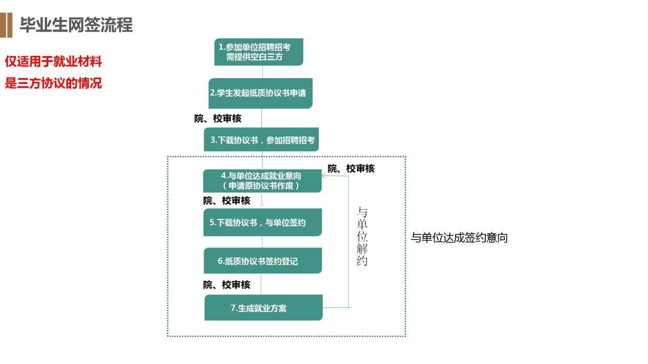 今年起,浙江省高校毕业生网上签约与毕业去向登记平台启用,毕业生三方协议书领取、签约后登记和作废解约均在平台上进行,具体流程如下: