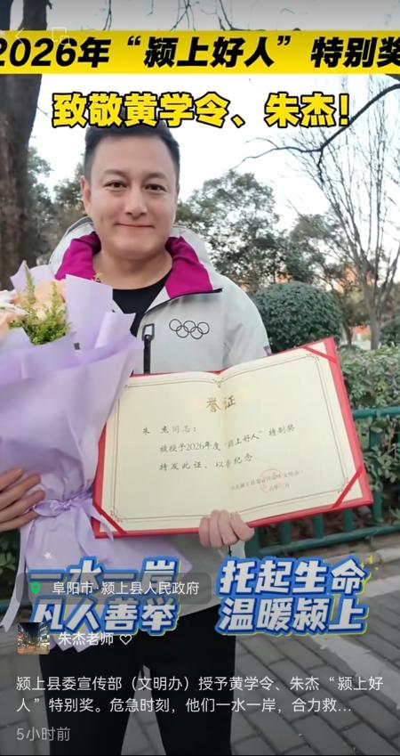 本网讯 近日,体育教育训练学院教师朱杰见义勇为、勇救落水群众的感人事迹引发广泛关注。中共颍上县委宣传部正式发布表彰决定,授予朱杰同志2026年度“颍上好人”特别奖,褒奖其危急时刻挺身而出、舍己救人的英勇行为,并向学校发来感谢函。