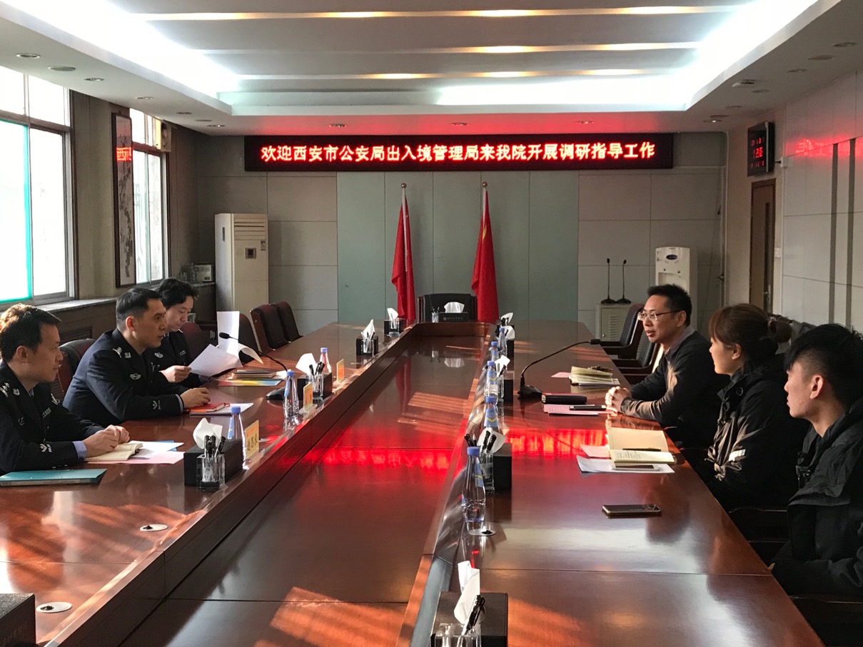 2019年12月20日上午,西安市公安局出入境管理局宋阳副局长一行来我校调研指导工作,国际交流中心朱军主任会见了宋阳副局长一行,国际交流中心办公室工作人员参加了调研和座谈。