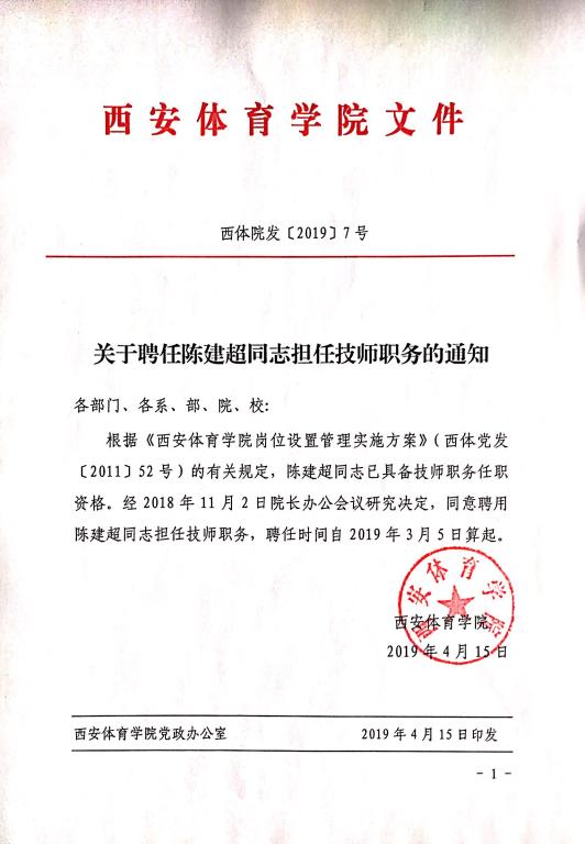 关于聘任陈建超同志担任技师职务的通知