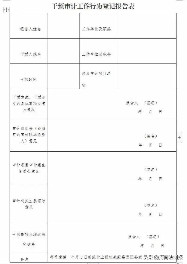 第五条 审计人员在审计工作中遇到干预行为的,应当填写《干预审计工作行为登记报告表》(见附表)。登记备案工作坚持“谁受干预谁登记”“一次一登记”原则,由受干预人登记备案。