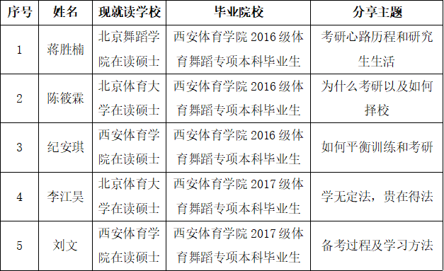 蒋胜楠讲述了自己的考研心路历程,建议大家提前定目标、做计划,找到自己擅长的领域和兴趣点,然后为之付出努力,过程固然艰辛,但也是人生中宝贵的经历和财富。陈筱霖属于跨专项学生,本科是体育舞蹈专项学生,硕士选择了篮球专项,他认为备考生应该根据自身情况选择报考专项,强调了读研的意义和对未来人生的影响,鼓励大家继续深造、开阔视野。纪安琪从平衡训练和考研展开,结合自己本科院队队员的身份,分享如何合理利用时间,如何分配时间,如何兼顾训练、比赛、备考,强调了提升理论知识水平对专业进步和平台扩展的的重要意义和促进作用。李江昊在建立动机,明确目标,搜集信息,考研的具体流程和时间段分配方面做了详细介绍,并分享了自己的学习方法和考研所需教材。刘文从为什么考研展开,不提倡盲目的从众思想,鼓励大家提前制定未来规划,尽早确定目标,将实现目标过程中的的影响因素一一排列出来,脚踏实地。