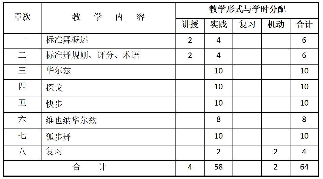 此课程为舞蹈表演专业的专业基础课程,大一第2学期开设,每学年标准舞课程共开设6个班。课程开展计划如下: