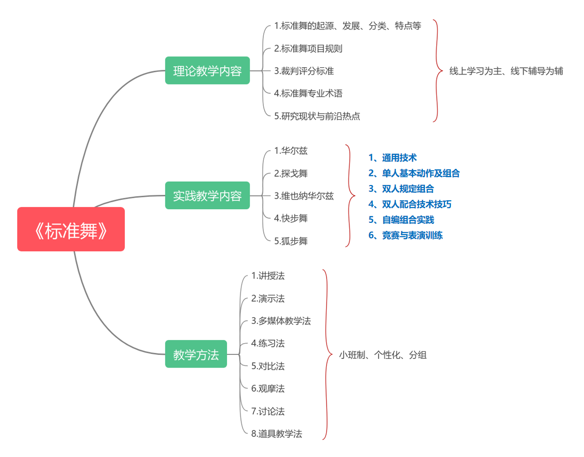 《标准舞》作为我校舞蹈表演专业的必修课程,教学计划共64学时,面向艺术学院舞蹈表演专业学生授课,目前采用线上线下混合式教学模式进行教学。课程团队结构合理且经验丰富,包括副教授2人、博士1人、体育舞蹈国家级裁判1人、体育舞蹈国家A级教师2人。