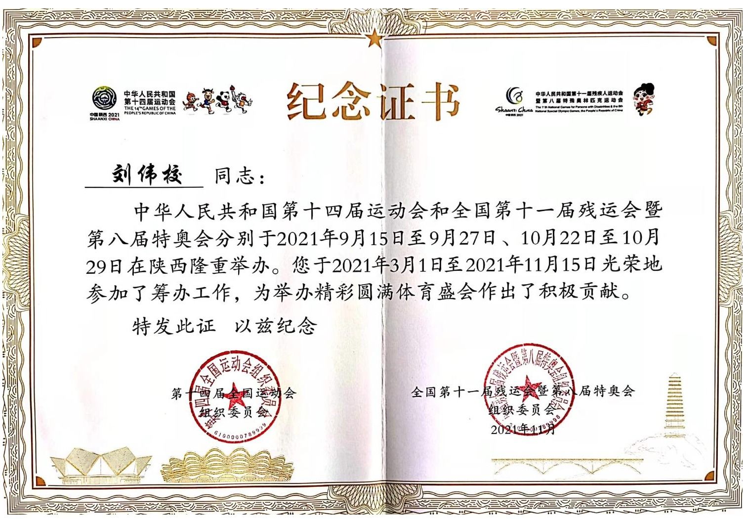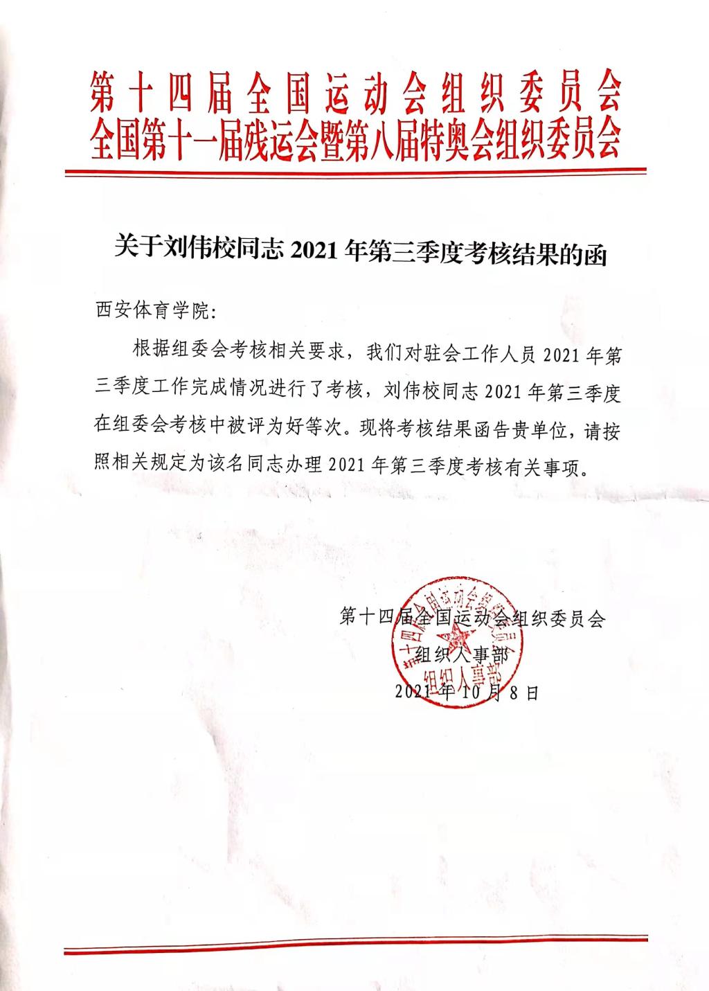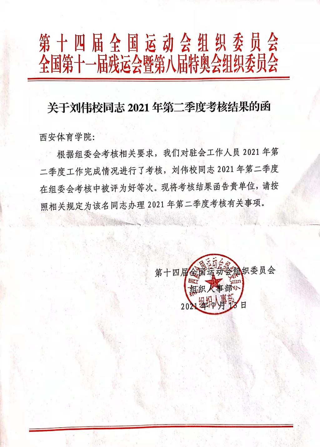 根据十四运会和残特奥会组委会工作安排,我院刘伟校老师于2021年3月至2021年11月参与十四运会和残特奥会组委会大型活动部工作。刘伟校老师借调期间,担当尽责、忘我工作,出色完成各项工作任务,得到组委会的充分肯定。 2021年两个季度考评为“好”等次,荣获组委会“奉献全运之星”称号。