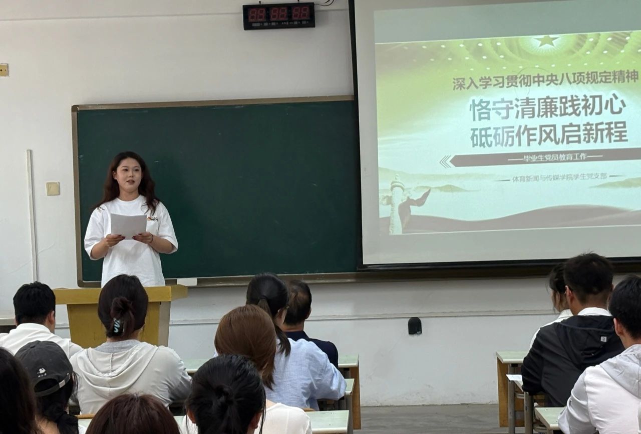 活动伊始,党委书记马增强以党课形式开展党性教育,首先向圆满完成学业的毕业生党员送上祝贺。他细数大家在校期间的奋斗足迹:在党组织活动中勇挑重担,在志愿服务里传递温暖,在学术竞赛中突破自我。“作为新时代党员,清廉是立身之本,中央八项规定是行为明镜。”马书记字字千钧,对毕业生党员提出“三个坚守”:坚守理想信念,在大是大非前站稳政治立场;坚守人民立场,以公仆之心践行服务宗旨;坚守奋斗底色,用实干担当锤炼过硬作风。他特别告诫,无论未来扎根传媒行业、投身体育事业,还是奔赴其他领域,都要以中央八项规定为标尺,坚决抵制享乐主义、奢靡之风,永葆共产党人清正廉洁的政治本色,以清正廉洁的品格和扎实的工作作风,在时代浪潮中贡献青春力量。