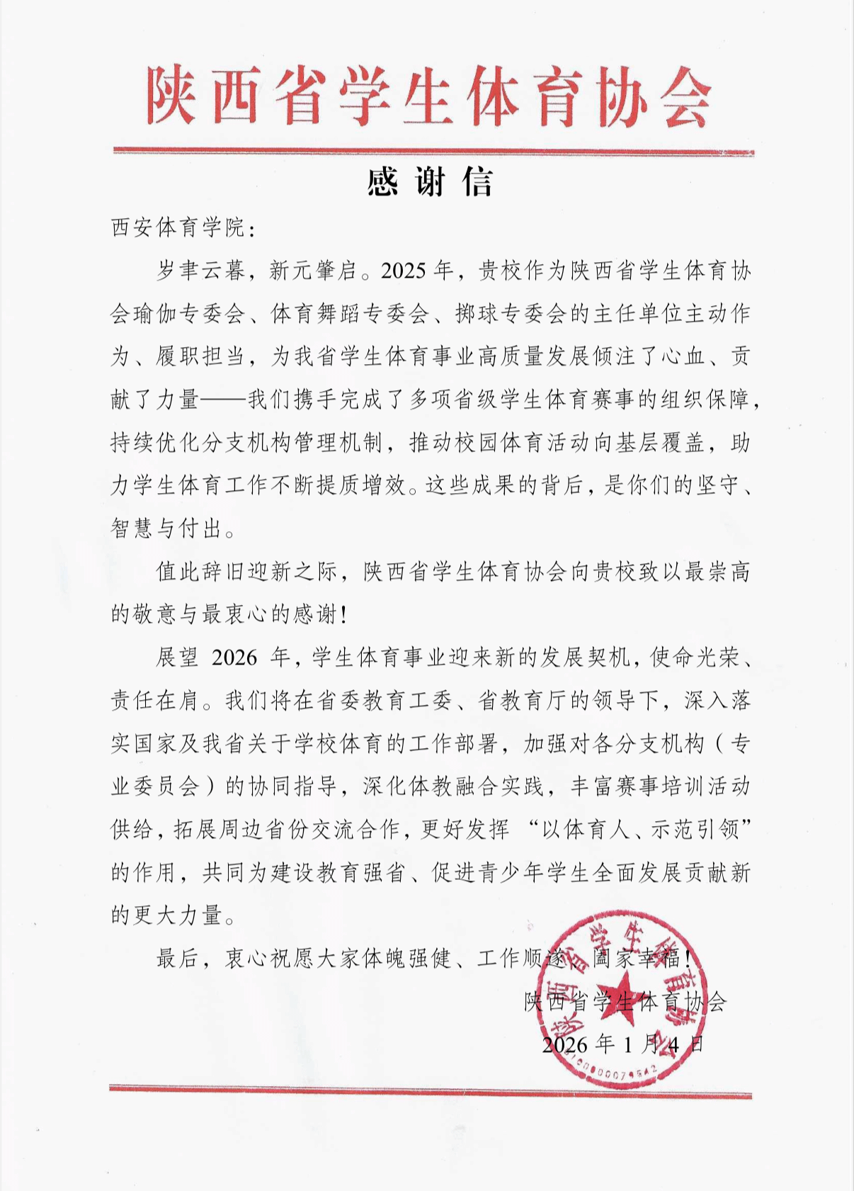 近日,我校收到陕西省学生体育协会发来的感谢信。作为省学生体育协会体育舞蹈专委会主任单位,我院体育舞蹈专业依托专业优势主动作为、履职担当,在2025年推动全省学生体育舞蹈事业高质量发展中作出突出贡献,获协会高度肯定与衷心感谢。