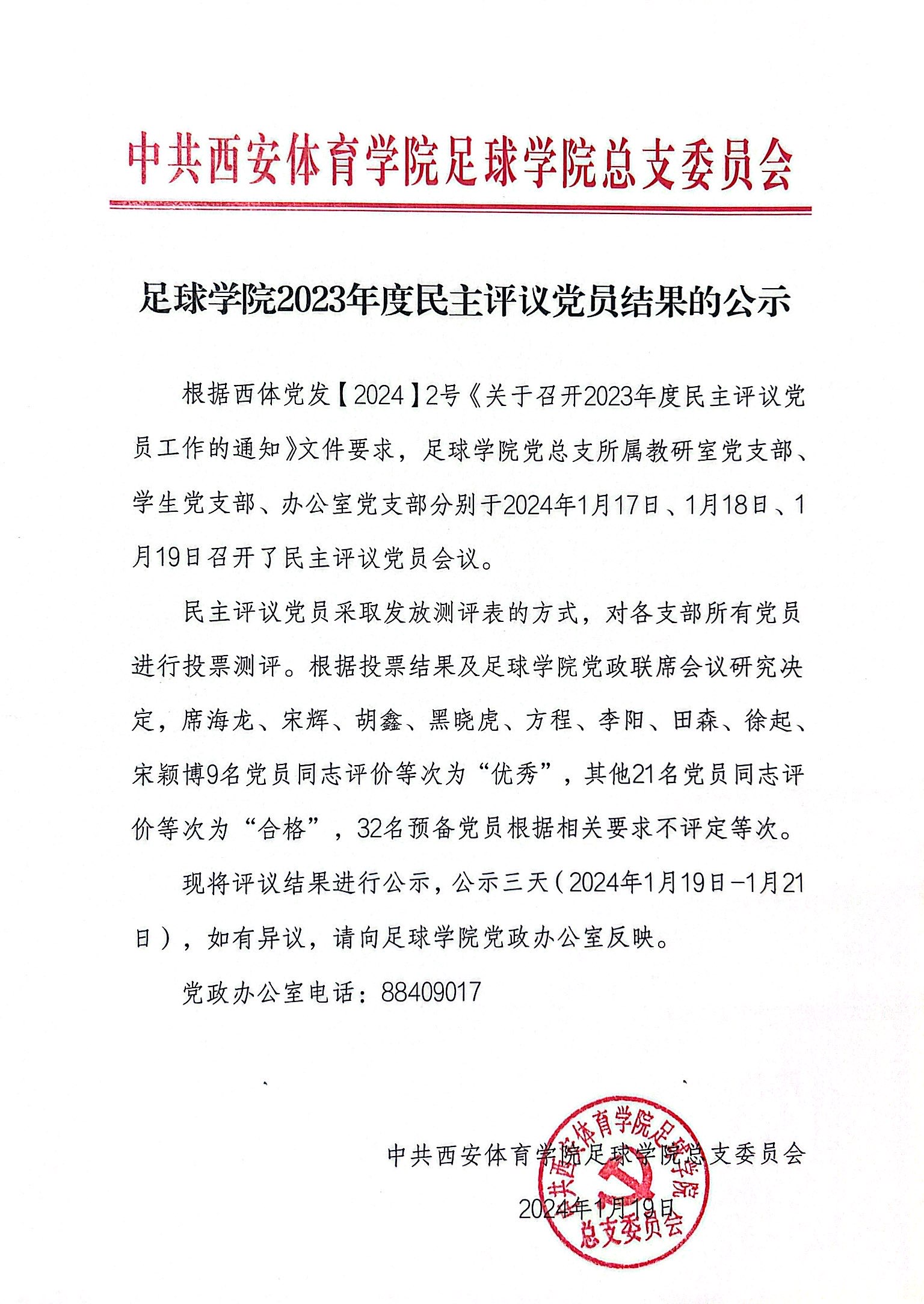 足球学院2023年度民主评议党员结果的公示