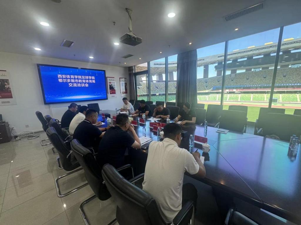 随后,双方举行座谈交流,鄂尔多斯市体育事业发展中心主任解远峰就近年来足球运动改革发展的情况、取得成绩和对引进足球人才的政策进行详细介绍。鄂尔多斯市教育体育局竞技体育科科长纳生道尔计对西安体育学院足球学院考察组一行的到来表示热烈欢迎,感谢西安体育学院对鄂尔多斯市教育体育事业给予的帮助支持,希望能够与西安体育学院足球学院保持紧密联系,得到专业人才支援。吕学宏对鄂尔多斯市足球事业改革发展取得的成绩给予高度评价,介绍了西安体育学院的历史和目前的发展情况、足球运动专业获批及国家示范足球学院评检情况,并表示愿意通过资源共享、互利共赢的方式,推动双方在人才培养、学生实训等方面加强交流与合作。